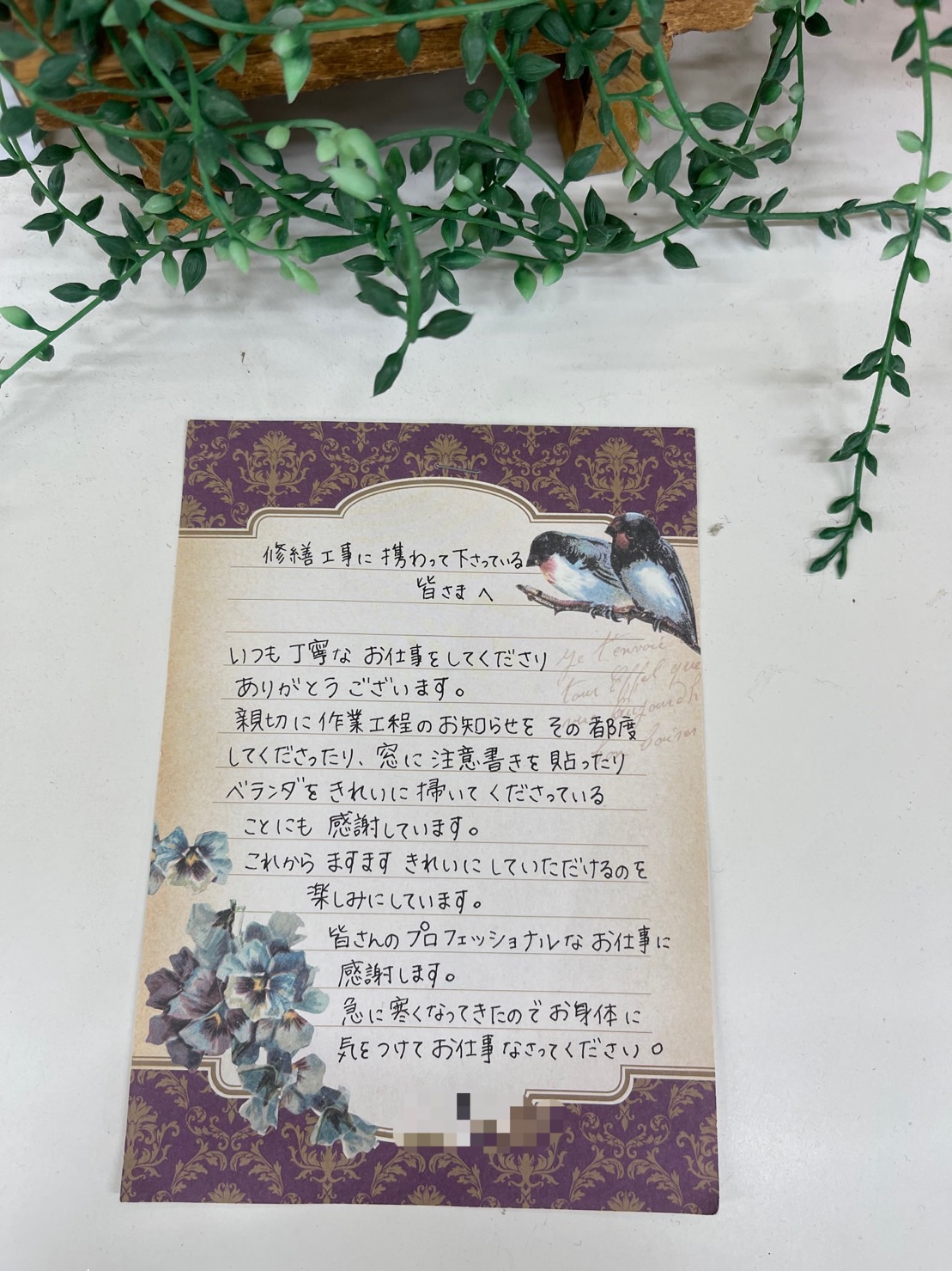 工事中、色々とご迷惑をお掛けしたと思いますのに、こんな手紙を頂けて、